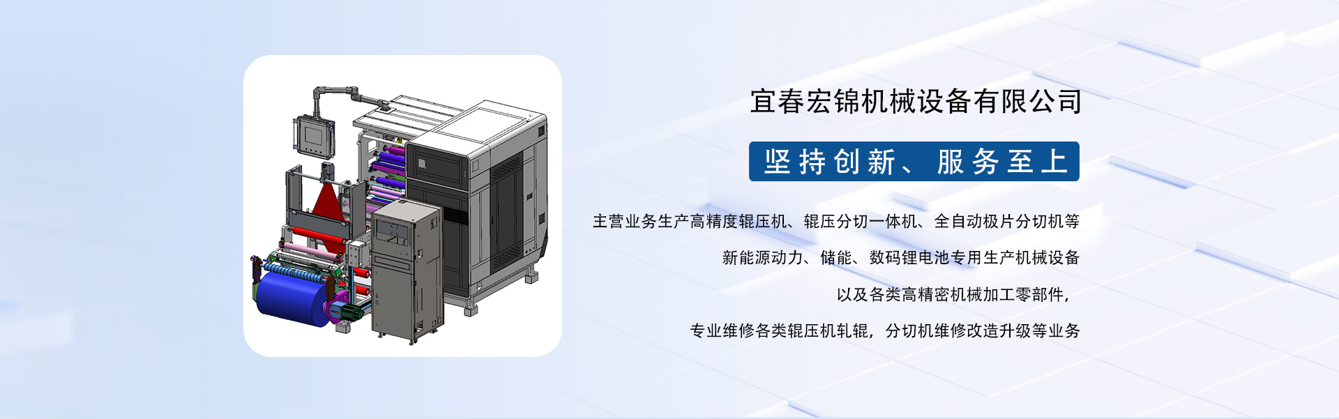 東莞市宏錦機(jī)械科技有限公司江西分公司是一家集研發(fā)、生產(chǎn)、銷售、服務(wù)于一體的創(chuàng)新型鋰電自動(dòng)化精密機(jī)械設(shè)備專業(yè)制造、服務(wù)商,坐落于江西省新余市渝水區(qū)新余經(jīng)濟(jì)開(kāi)發(fā)區(qū)孵化園5號(hào)廠房,廠房面積近6000平米,由東莞市宏錦機(jī)械科技有限公司于2024年11月投資新建,交通區(qū)位優(yōu)勢(shì)明顯、產(chǎn)業(yè)配套便捷集中,擁有一批具有行業(yè)豐富經(jīng)驗(yàn)的技術(shù)人員和管理團(tuán)隊(duì)。公司主營(yíng)業(yè)務(wù)生產(chǎn)高精度輥壓機(jī)、輥壓分切一體機(jī)、全自動(dòng)極片分切機(jī)等新能源動(dòng)力、儲(chǔ)能、數(shù)碼鋰電池專用生產(chǎn)機(jī)械設(shè)備以及各類高精密機(jī)械加工零部件,專業(yè)維修各類輥壓機(jī)軋輥,分切機(jī)維修改造升級(jí)等業(yè)務(wù)。根據(jù)公司發(fā)展三步走戰(zhàn)略規(guī)劃經(jīng)營(yíng)現(xiàn)下設(shè)三個(gè)二級(jí)獨(dú)立運(yùn)營(yíng)事業(yè)部分別為分切事業(yè)部(分切機(jī)、輥壓分切一體機(jī))、磨輥事業(yè)部(輥壓機(jī)、軋輥修磨)、機(jī)加事業(yè)部(精密機(jī)械部件加工)。經(jīng)過(guò)十余年沉淀發(fā)展主要客戶有新余贛鋒、南昌維科、宜春清陶、云南路華、河南恒一、江西程疆、四川天萊、蕪湖天弋、惠州億緯鋰能、無(wú)錫盤古新能源、鄭州比克、安徽鋰天下、臺(tái)灣長(zhǎng)利(宏基集團(tuán))、重慶維都利(紫建電子)、贛州諾威、安徽利維能、漳州萬(wàn)寶、重慶佳寶成、廣西皇冠儲(chǔ)能等一批具有行業(yè)知名度和影響力的企業(yè)。公司在新能源發(fā)展的道路上堅(jiān)持創(chuàng)新,為客戶帶來(lái)穩(wěn)定、高效的自動(dòng)化專用設(shè)備和更大的收益。